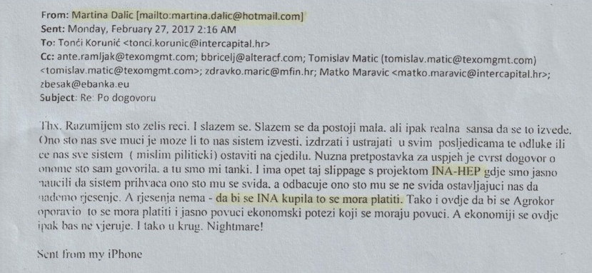 Isto tako, muž Martine Dalić, koju vjerujem vrlo dobro poznajete iz Afere Hotmail, supotpisnik je spornog memoranduma oko INA-e.