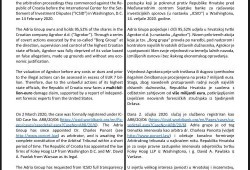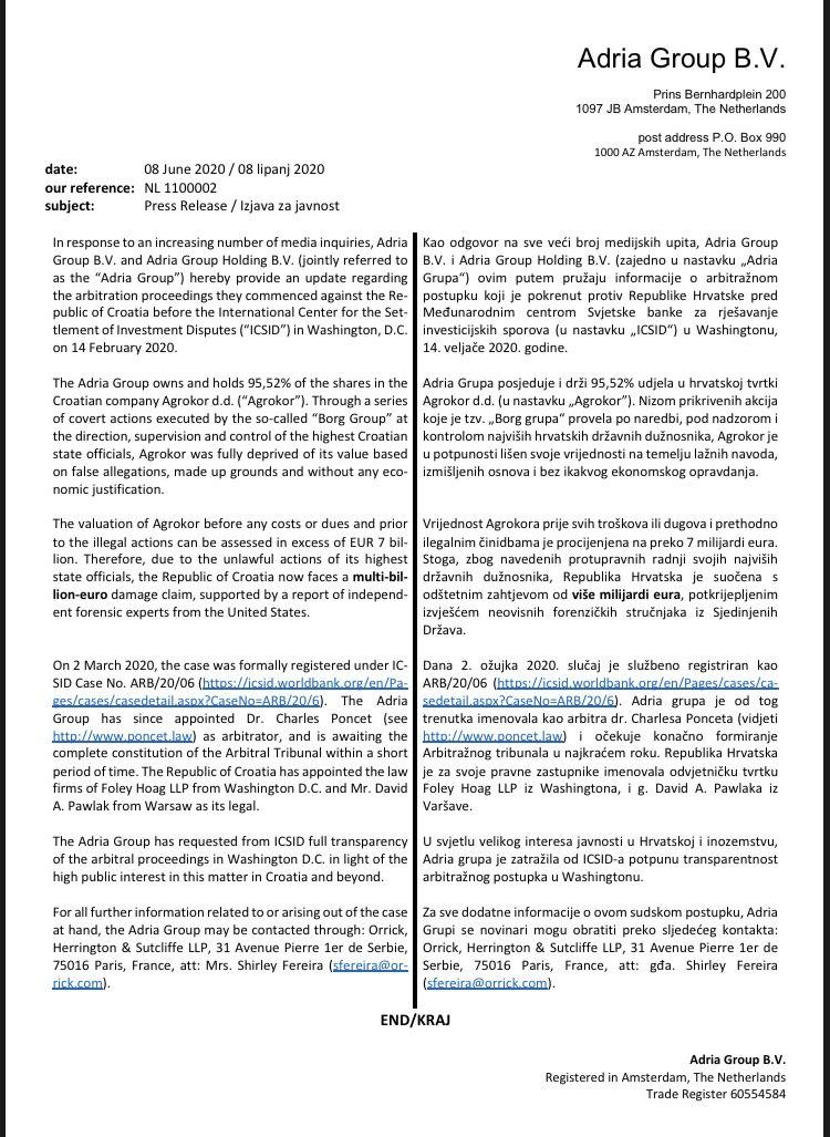 Kao odgovor na sve veći broj medijskih upita, Adria Group B.V. i Adria Holding B.V. (zajedno u nastavku "Adria Grupa") ovim putem pružaju informacije o arbitražnom postupku koji je pokrenut protiv Republike Hrvatske pred Međunarodnim centrom Svjetske banke za rješavanje investicijskih sporova (u nastavku "ICSID") u Washingtonu.