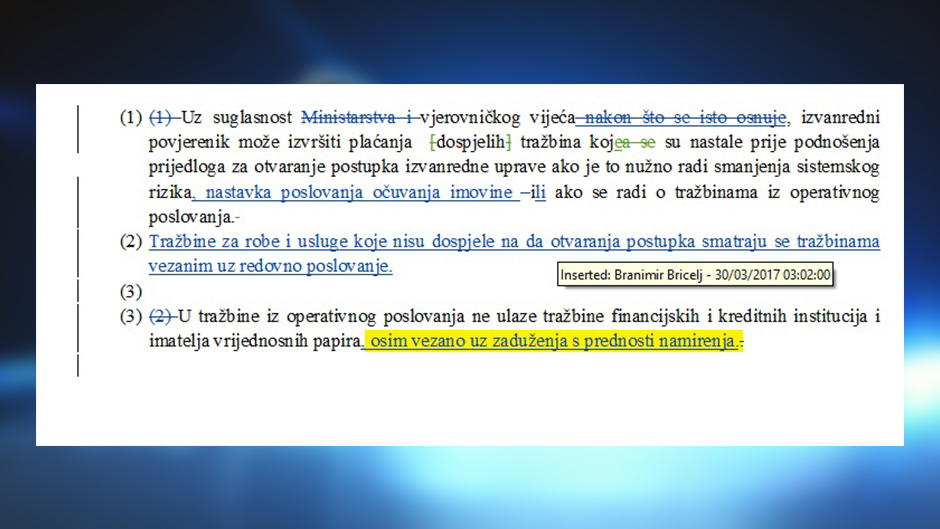 - 30.03.2017. u 3 sata ujutro Branimir Bricelj iz BORG Grupe unosi izmjenu u Lex Agrokor i omogućava time tzv. Roll-Up, te ogromnu dobit Knightheadu kroz mogući otkup obveznica