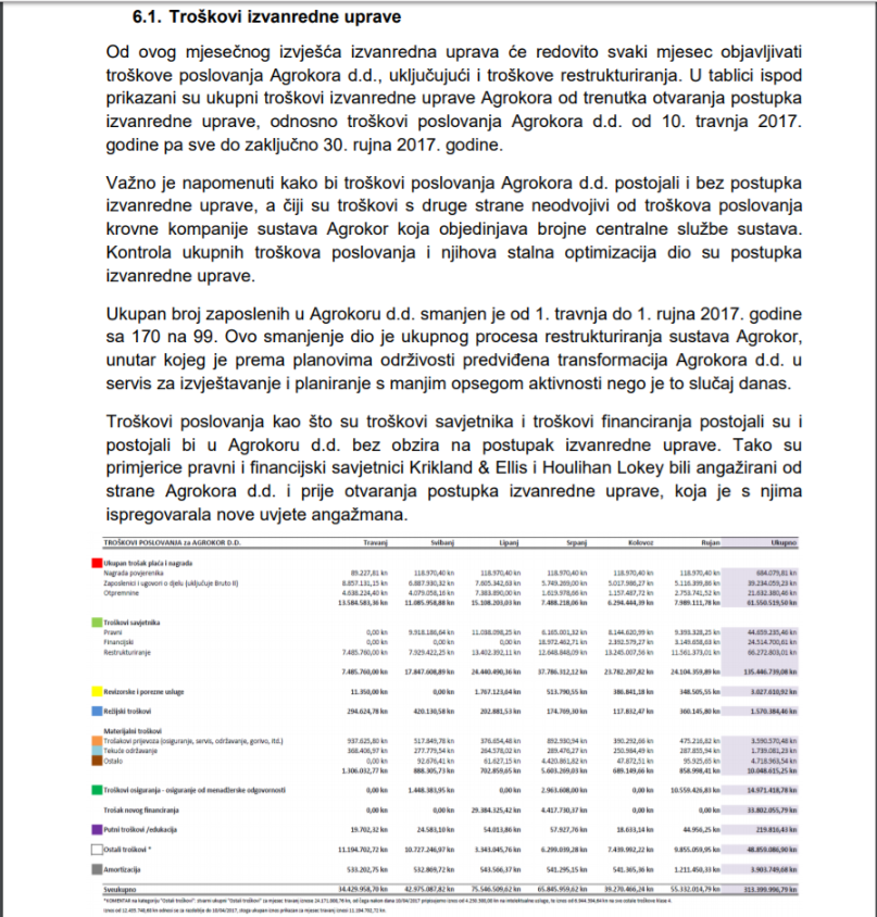 Ovdje je prikazana komparativna analiza s 29., 30., i 32. stranicom izvještaja izvanredne uprave Agrokora za period od 10. listopada do 10. studenoga. Svi podaci koji Ramljaku i Knightheadu ne odgovaraju za provedbu njihovih interesa napisani su toliko malim fontom da ih se ne može iščitati. No, kad se cijelo izvješće sagleda kroz stručnu prizmu, odmah je vidljivo da su manipulacije toliko velike da su neobjašnjive. Šteta koju će svojim djelovanjem napraviti Ramljak prerasta u nevjerojatnu financijsku diverziju iz koje korist izvlače od Vlade odabrani pojedinci, odvjetnička društva i strani fondovi. Šutnja i nečinjenje dok se privatna imovina oteta neustavnim Lexom pljačka, prerasta u organizirani kriminal najvećih razmjera.