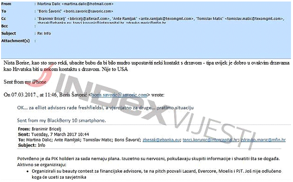 - Nikakav pravni postupak nije bio otvoren niti protiv I. Todorića niti Agrokora d.d.! Boris Šavorić se dogovara s članom Vlade RH, M. Dalić - čitaj Plenkovićem - koji su koraci, kako će se ponašati, kako napraviti što veću štetu da bi oteli Agrokor grupu i meni osobno i mojoj obitelji nanijeli štetu. Vidjet ćete što pišu u mailu, a onda možete samo zamisliti kako su komunicirali kada su se sastajali u četiri oka ili u krugu svoje zločinačke organizacije.