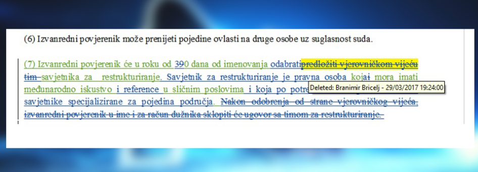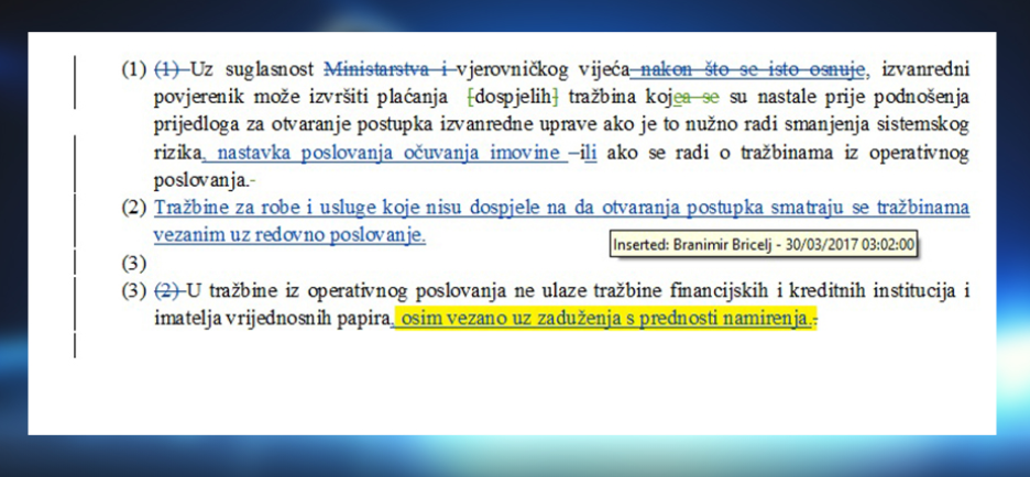 a) BORG grupa odnosno Branimir Bricelj je ovaj puta planski dva dana prije usvajanja Zakona na Vladi RH unio zakonsku odredbu tako da Izvanredni povjerenik može sam izabrati savijetnika za restrukturiranje. Iskljućio je Privremeno vjerovničko vijeće iz nadzora ove odluke