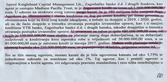 Još jednom želim ustvrditi da je Izvanredni povjerenik A. Ramljak ugovorio toliko troškova sa Knightheadom i njegovim partnerima da na kraju niti jedan EUR od kredita (Roll up-a) nije ostao Agrokoru za operativno poslovanje, a kamoli 250 milijuna EUR koliko Ramljak izjavljuje.