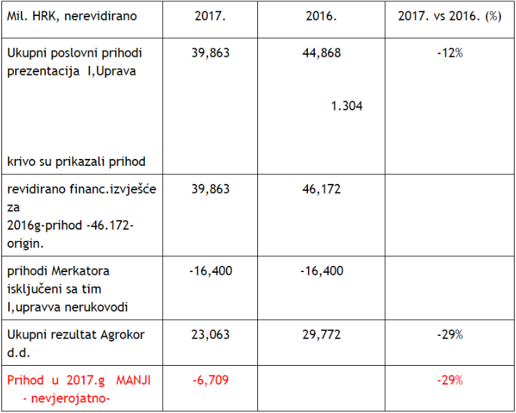 Ukupni poslovni prihod Grupe Agrokor kojim je u 2017. godine upravljala vladina Izvanredna uprava pao je u odnosu na peroid moje uprave ( 2016. g.), za nevjerojatnih 6.709 milijardi HRK ili za 29 % ! Ovo je, najblaže rečeno, katastrofa za Agrokor, sve njegove dionike, kao i cijelu hrvatsku ekonomiju. Ako se ovaj kaos, ovaj kriminal hitno ne zaustavi, bit će još ozbiljnijih posljedica.