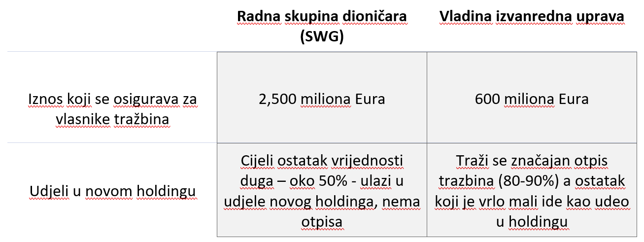 - ostatak duga za tražbine, otprilike oko 50% vrijednosti, išao bi u udjele novog holdinga, ništa se ne otpisuje