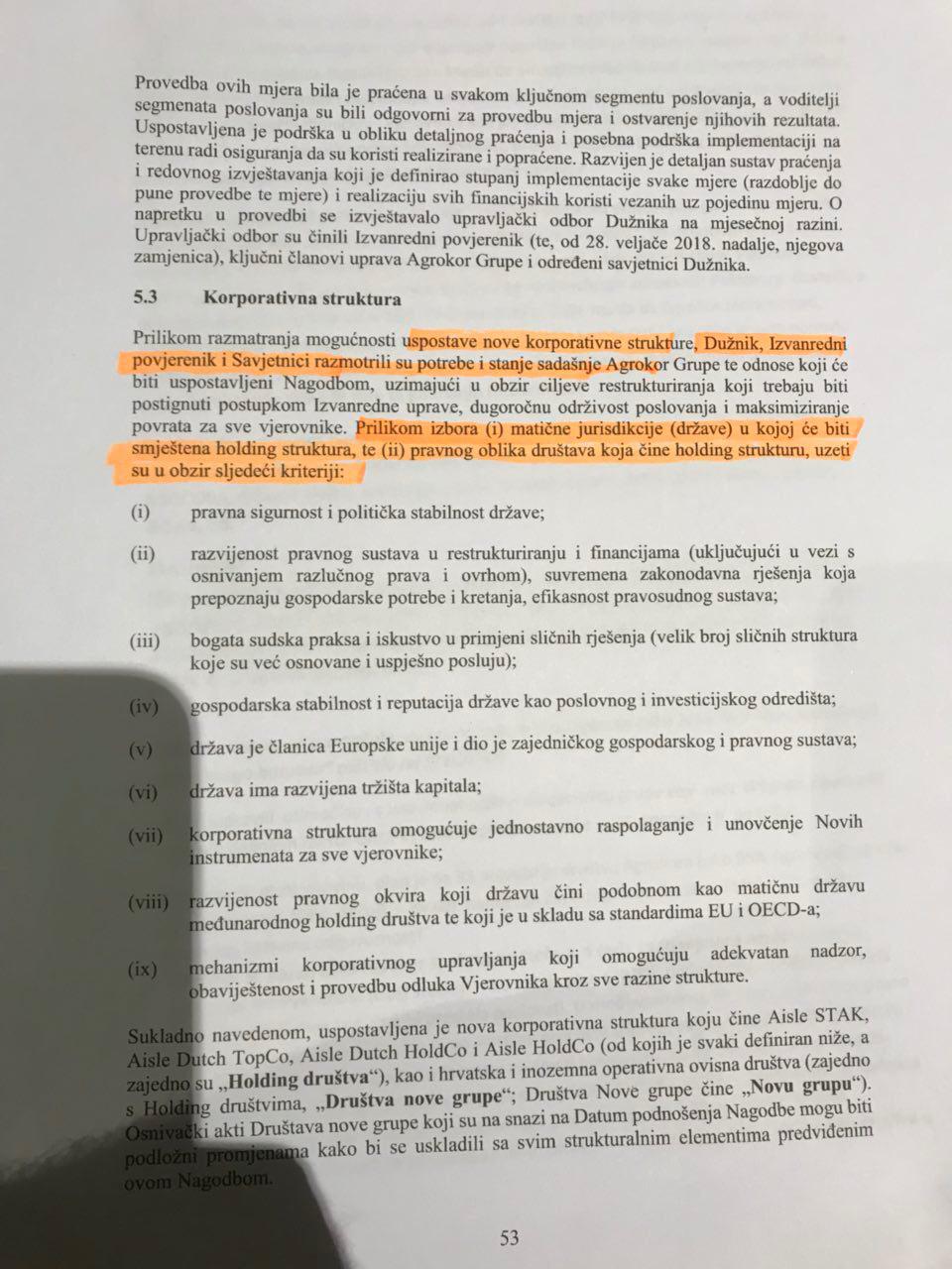 NAGODBA st. 53 - Vezano uz uspostavu nove korporativne strukture, - izvanredna uprava i (naravno) savjetnici postavili pitanja gdje je najbolje mjesto da novi strani vlasnici registriraju sjedište Agrokora. I to sljedeća pitanja: politička stabilnost države? Razvijenost pravnoga sustava...? Bogata sudska praksa ...? Gospodarska stabilnost.....? Razvijenost pravnoga okvira.....? Mehanizam korporativnog upravljanja koji omogućava..............donošenje odluka vjerovnika kroz sve razine strukture?